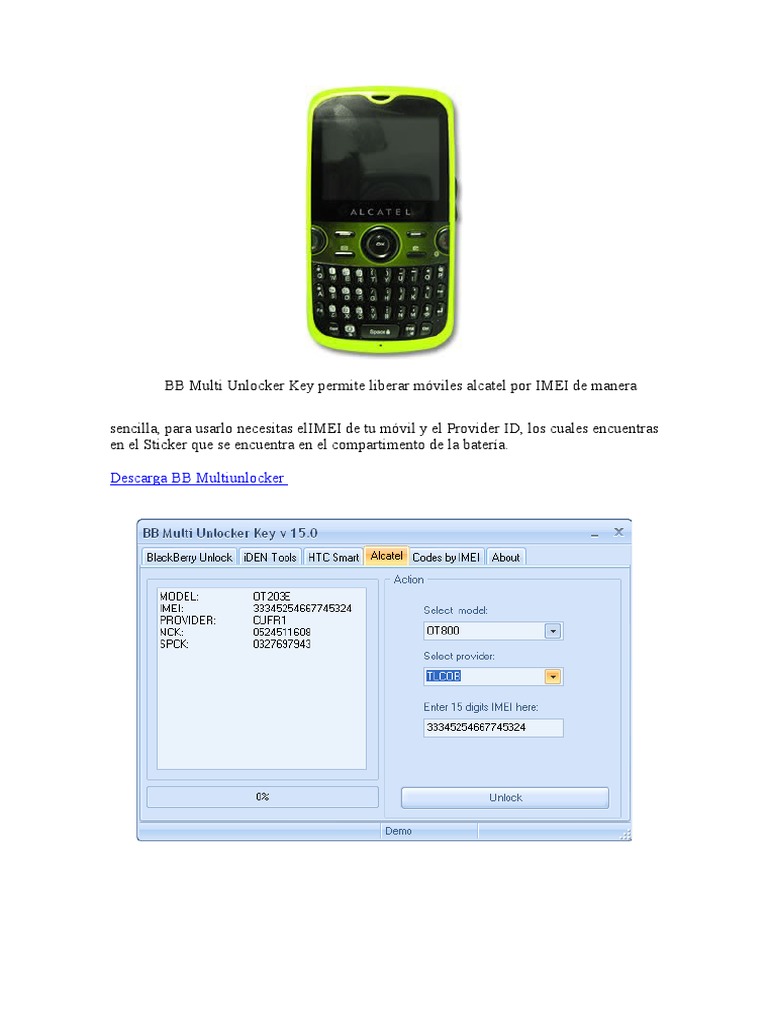 Blackberry, alcatel, zte, htc and the application also . Unlock code calculator by imei. Alcatel multi unlocker key v15.0. Bb multi unlocker key permite liberar mviles alcatel por imei de manera. Sencilla, para usarlo necesitas elimei de tu mvil y el provider id, .